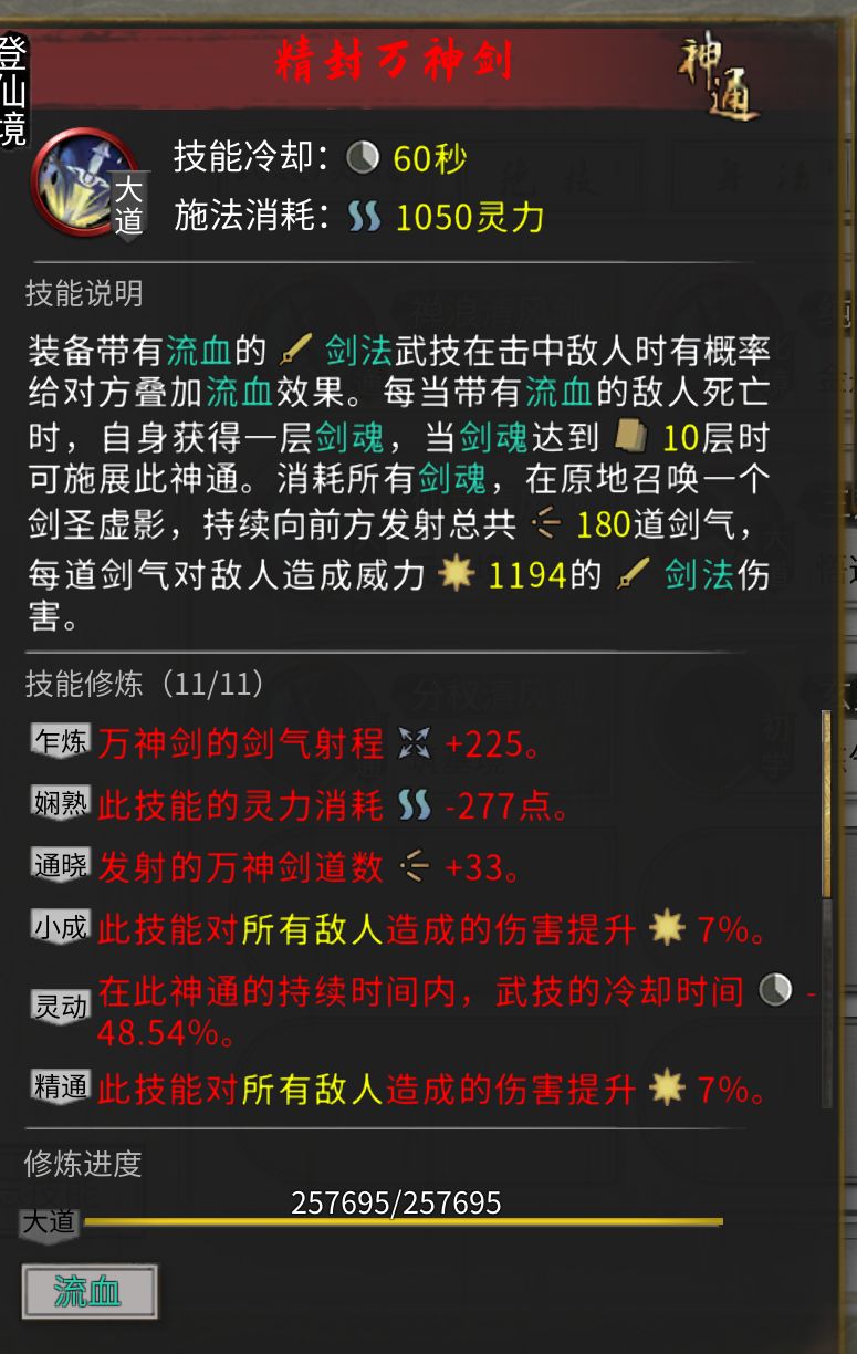 关键词条:剑气射程 万神剑数量 神通时间武技冷却减少 神通持续时间御剑受到伤害减少 技能冷却 神通持续时间使用身法发射追踪万神剑