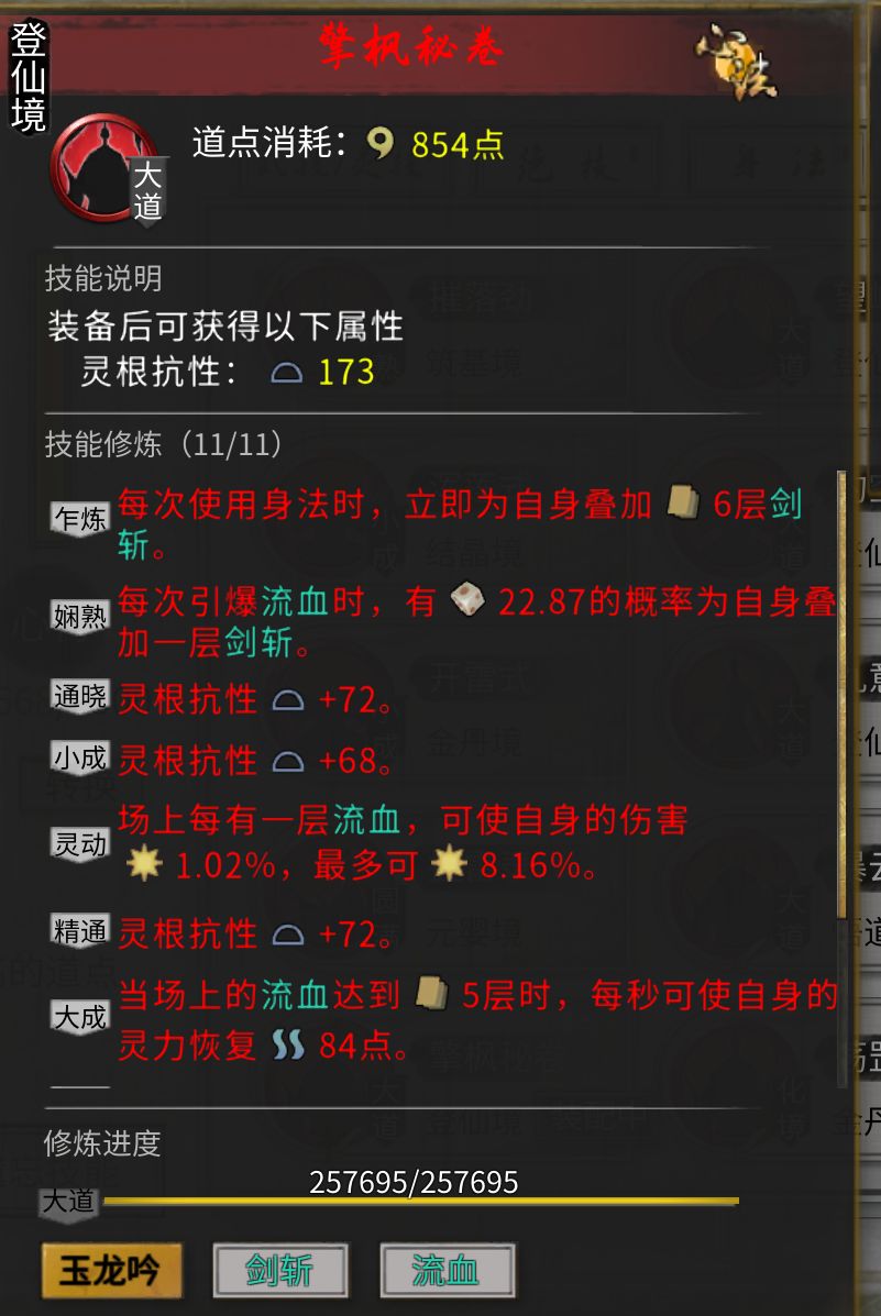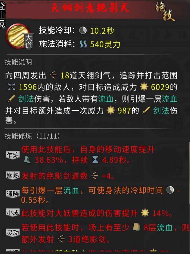 关键词条:使用技能后移速增加 (用来契合后面要说的逆天改命穿云闪电) 绝影剑数量增加 每引爆一层流血身法冷却减少 (因为我们不是0CD所以要用绝技刷新身法) 额外发射绝影剑 冷却时间 引爆流血伤害增加 射程增加