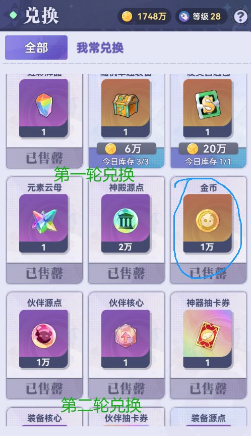 (下面关于金币子的使用,都是在我当前等级也就是29级的情况下,每天的金币子大概有1500万上下,所以前两轮买完还剩一些,但是买第三轮就不够了,如果等级高的金币子充足,当然是看缺什么买什么,比如虹彩结晶可以多买)