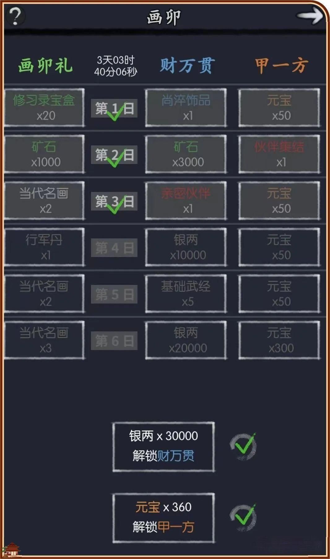 画卯礼是可以直接达到天数要求就可以领取的,财万贯需要3w银两解锁后领取,甲一方需要360元宝解锁后领取。由于解锁的银两和元宝在这个活动周期走完后都会通过领取的奖励返还给你更多的银两和元宝,并且有2个比较好的东西可以领取,伙伴集结,打开是一张十连宴请贴。亲密伙伴,宴请池子里的全侠客自选,不要随便开不要随便开不要随便开重要的事情说三遍!!!斟酌好前期配队再考虑开哪个侠客能让你起步快人一等。这就是新手期第一个活动画卯的全部内容。