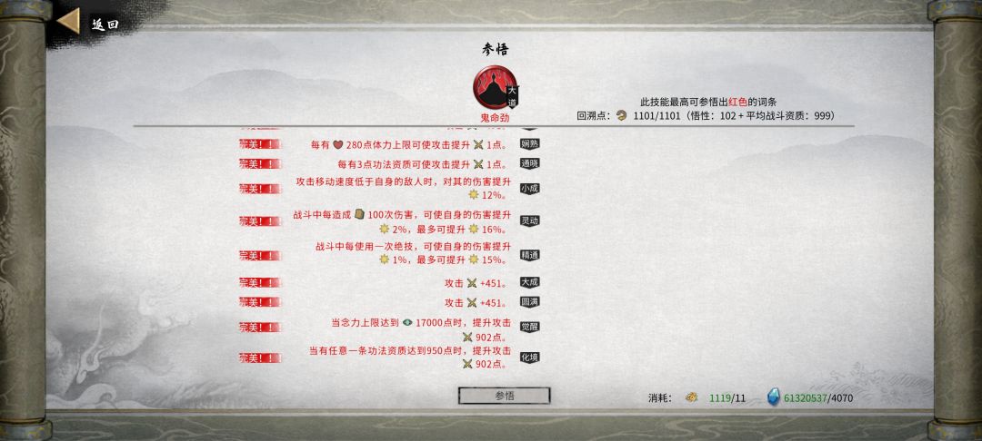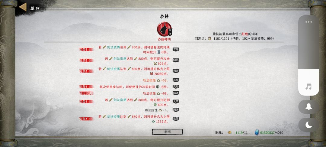 剑神功核心词条:①每次使用身法,绝技冷却-X秒;②剑资质达到X,身法持续时间提升X秒。