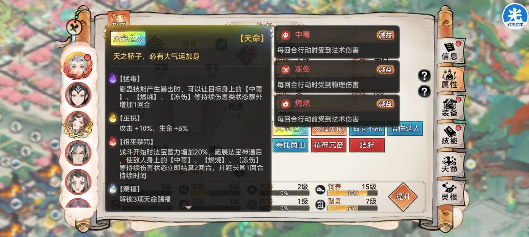 因为'伏妖试炼'有着额外掉一次buff回合数的特性,因此猛毒也是一个保证高质量buff存在的优秀天命