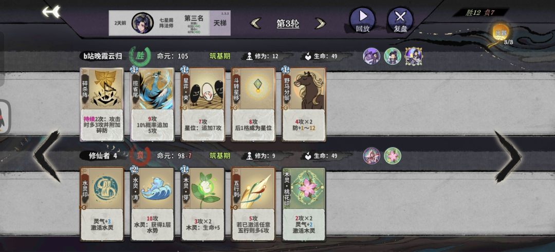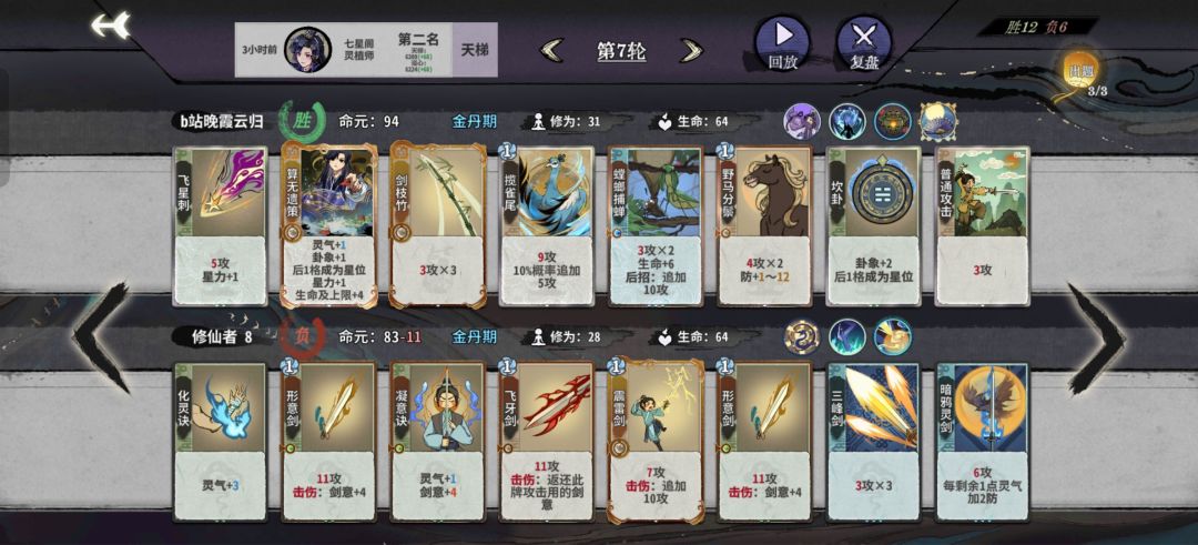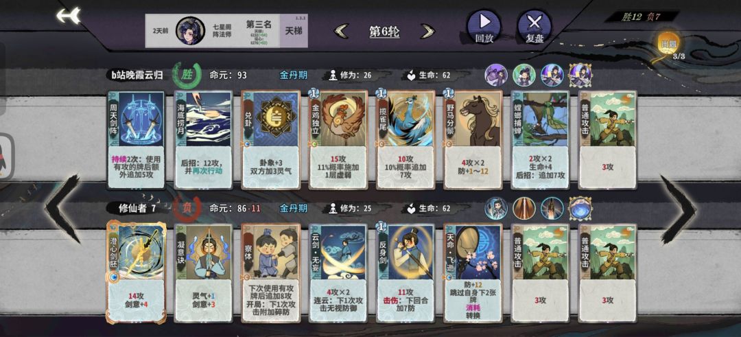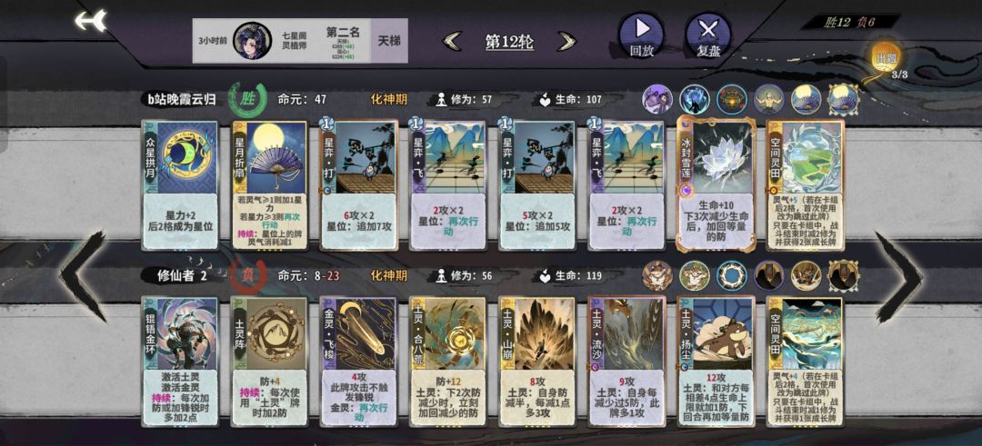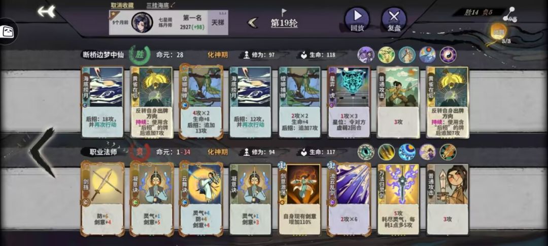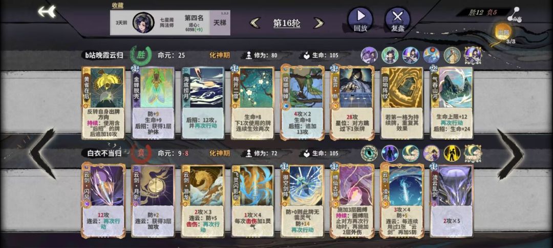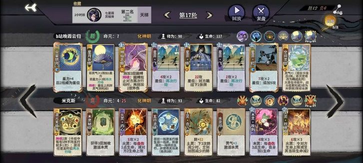 阵后招:由于仙命选择计出万全和瞒天过海,上本节奏相对比较慢,12甚至13轮化神。阵相对来说是一个比较烧脑和吃理解的玩法,所以同时也趣味多多。阵对化神卡的需求量非常大,刚上化神因为牌不够容易掉血暴毙,所以比较吃技师操作。