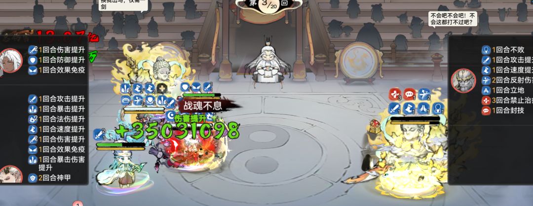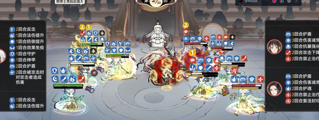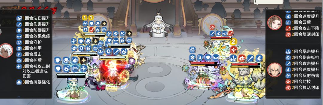森罗魔功在残局的压制力也是很不错的,给敌方三人都挂上了封技和禁止治疗的debuff。下回合,石僧释放法宝后还会给敌方挂上禁止增益的buff,这就导致敌方和尚的不败无法触发,会直接死亡。