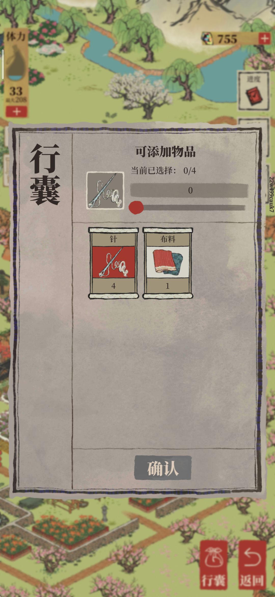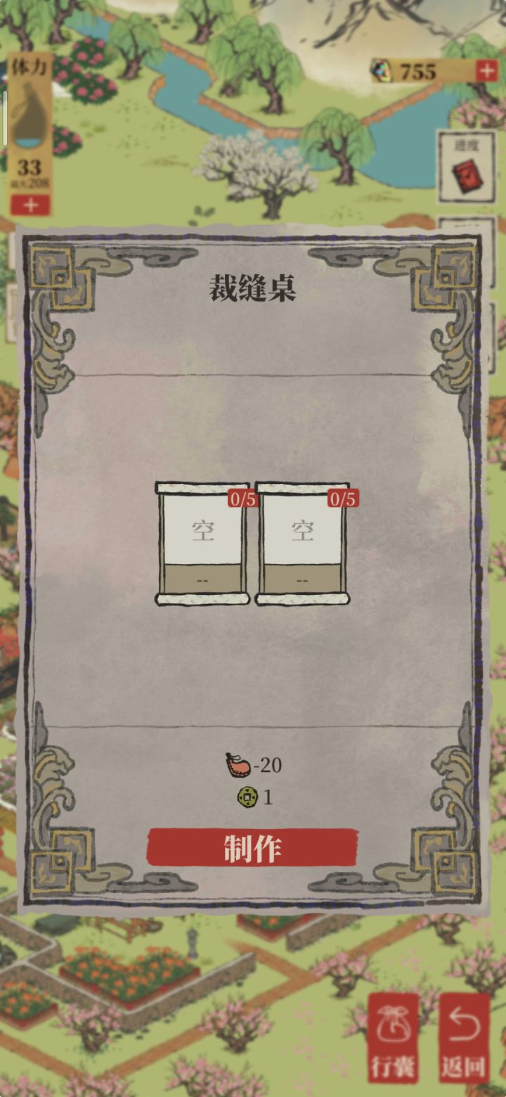 5针5布料1铜钱20体力=5荷包。