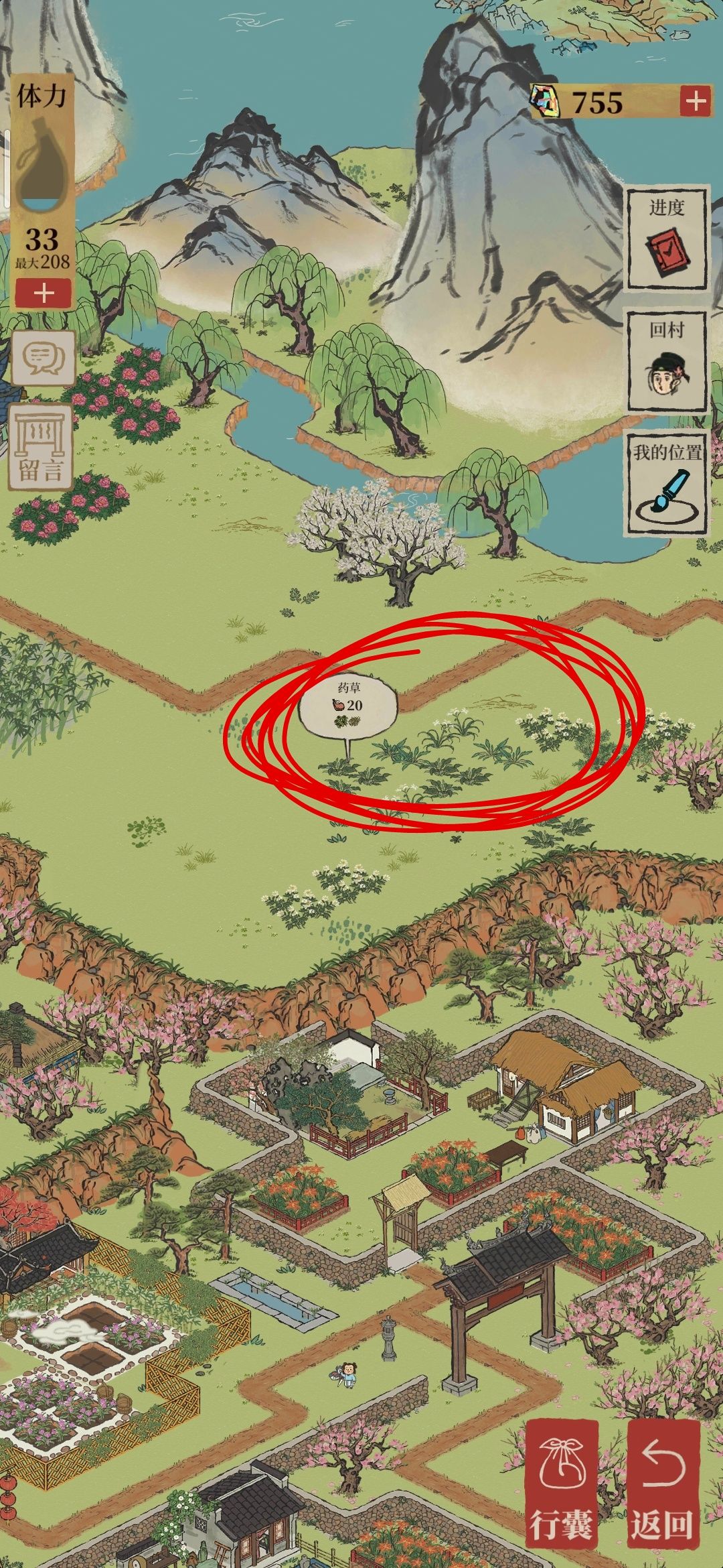 药材:地图右下角,游人休憩点下面;