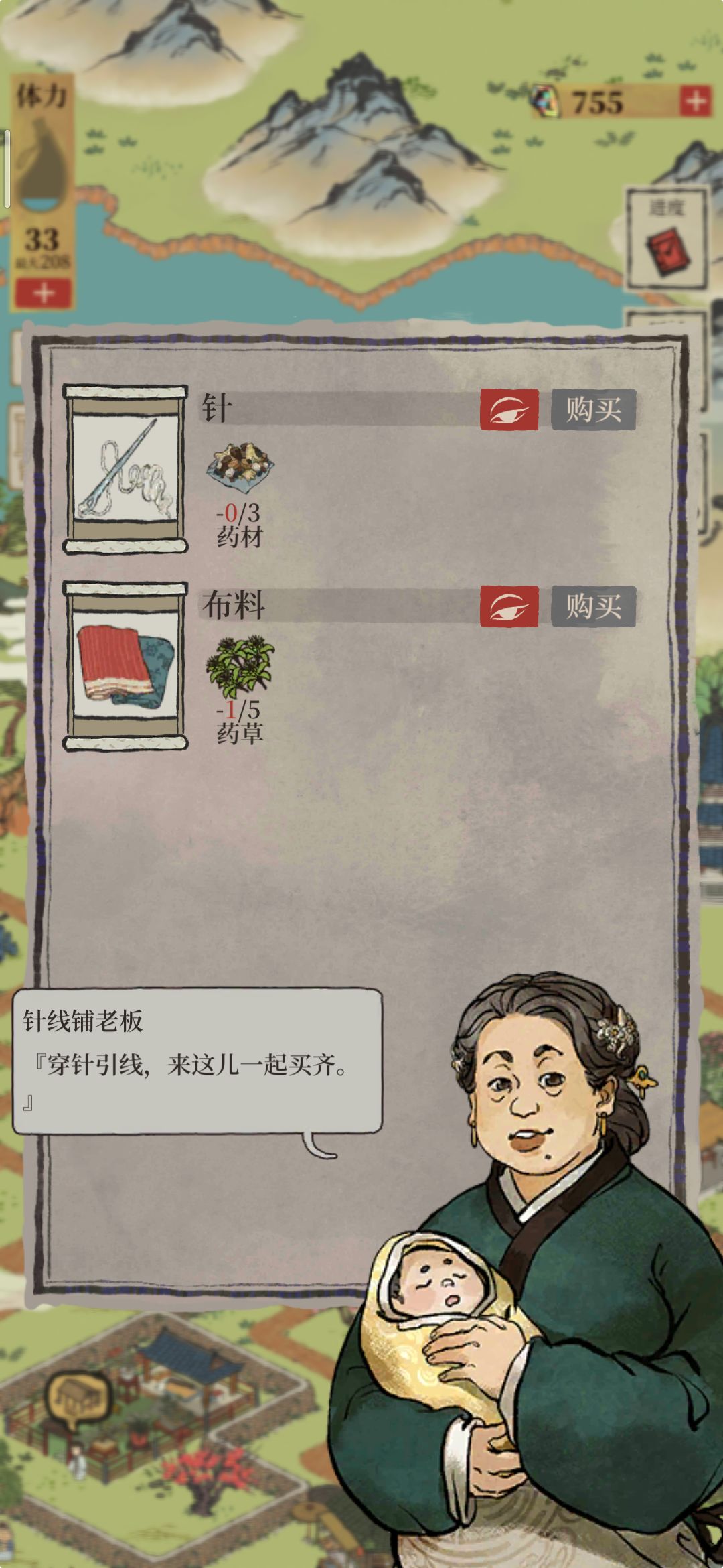 针、布料获取:针线铺老板。②