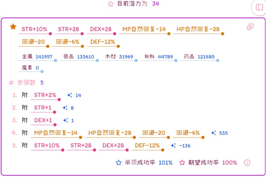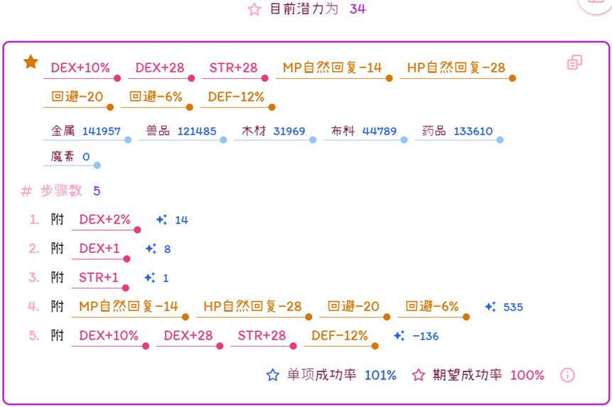成功率公式:成功率=10+熟练度+TEC/2+DEX/6+STR/10-装备难易度