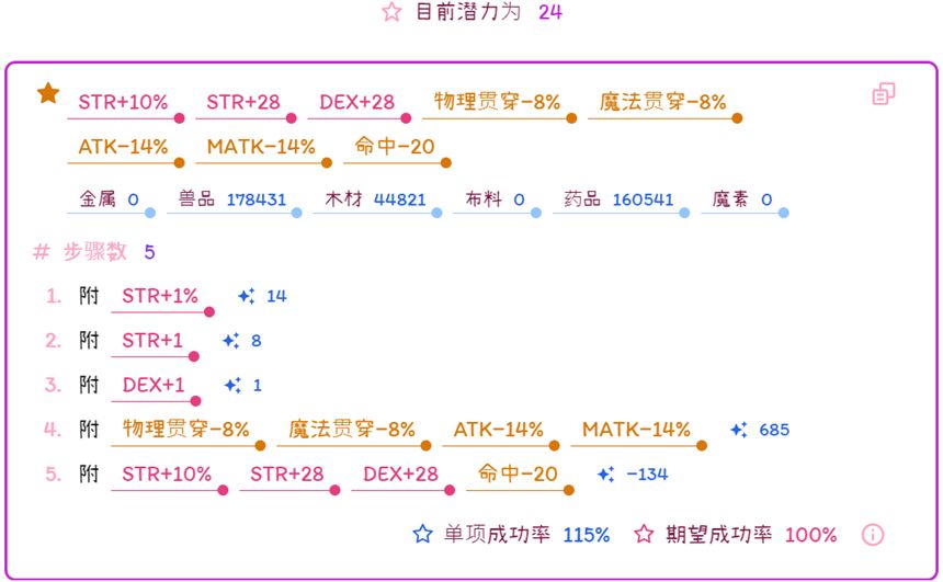 匠装的主要作用变为尽量提高自身难易度与装备难易度之间的跨度,即提高自身难易度。而自身难易度主要与熟练度、TEC和DEX有关,因此在讨论各种匠所需要的匠装时,我们主要看中的是DEX的提升。而当成功率无法达到100%时,才会考虑STR的数值。