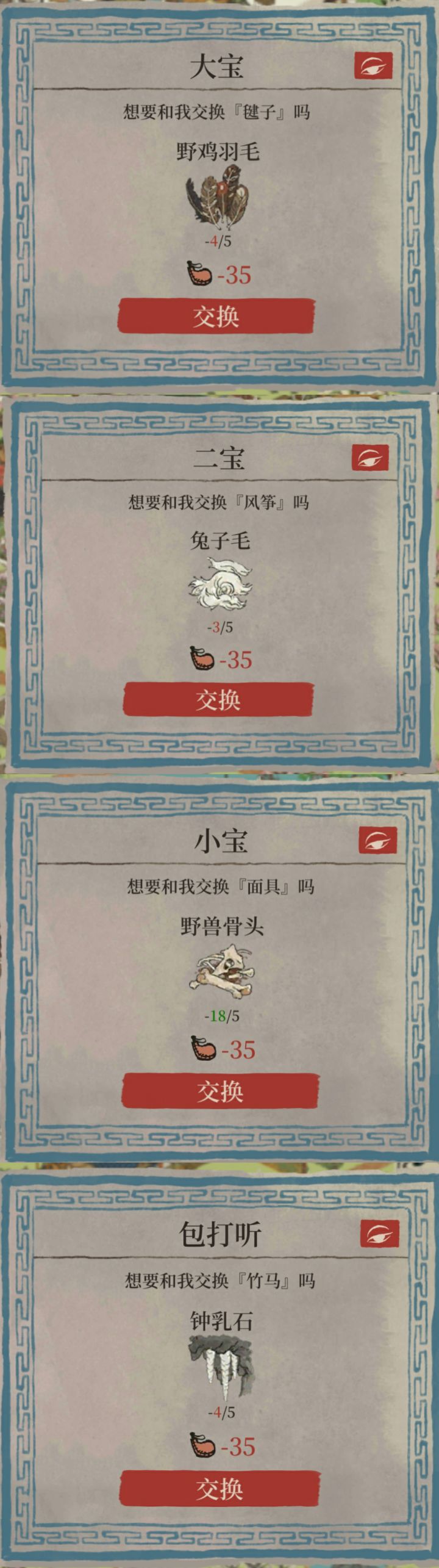 5兔子毛35体力=1风筝,5野草20体力≤1兔子毛。②