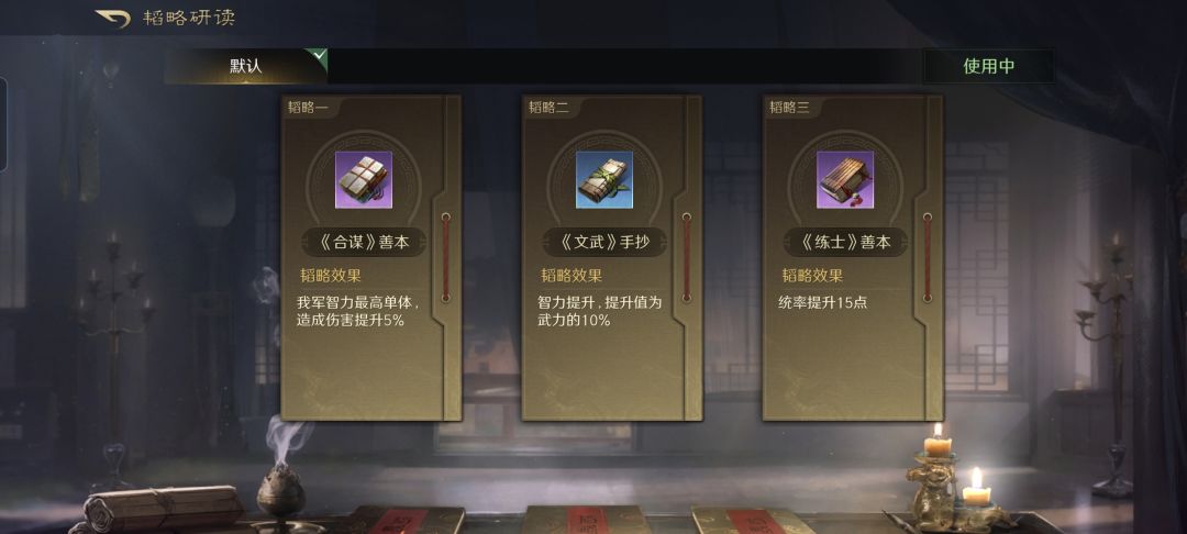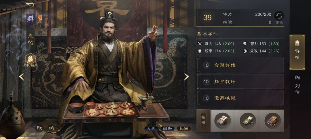 袁绍战法:合聚群雄+指点乾坤+运筹帷幄。韬略库:合谋善本+文武手抄+练士善本。高级兵种:丹阳精兵点亮重振旗鼓。