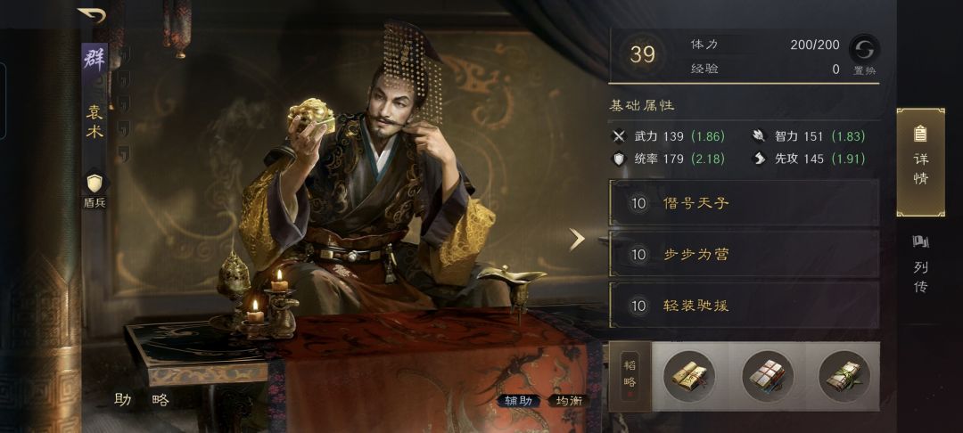 袁术战法:僭号天子+步步为营+轻装驰援。韬略库:临峰善本+分治善本+敌勇手抄。