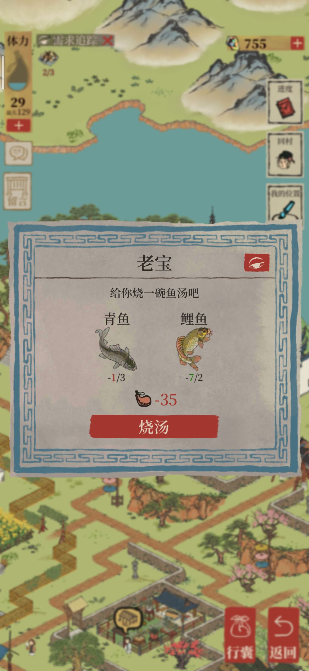3青鱼2鲤鱼35体力=1鲜美鱼汤。2、钓青鱼、鲤鱼:
