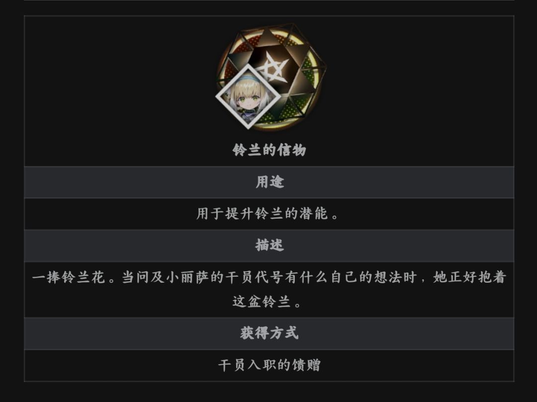 ②铃兰的原名是丽萨,问她加入罗德岛996的时候喜欢什么代号,她手里刚好抱着一盆铃兰。