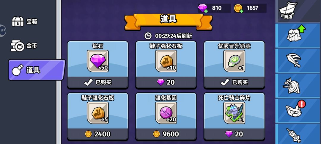 7. 道具商店里会刷新装备强化石板、装备、角色碎片和晋升勋章等道具。