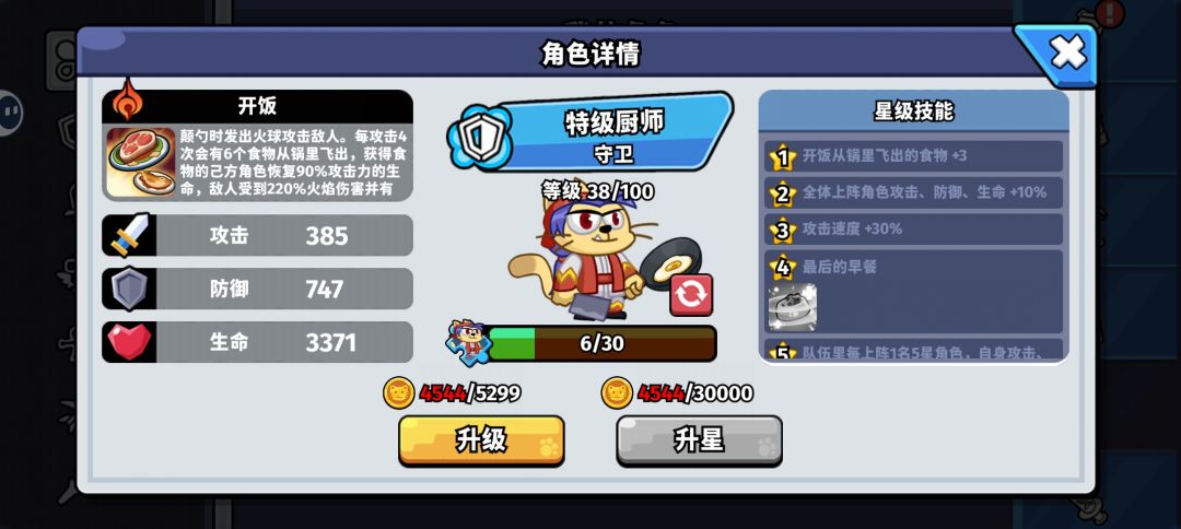 2.这里简单解释一下为什么可以抽到特级厨师就停手,省得有兄弟不了解他的技能。特级厨师的职业是守卫,他的技能是每4次攻击会飞出6个食物,食物飞到友方角色上会治疗他,飞到敌方会造成伤害并有概率眩晕,这个技能能让他极大程度的缓解奶妈的治疗压力,这个是其他两个守卫都做不到的事。