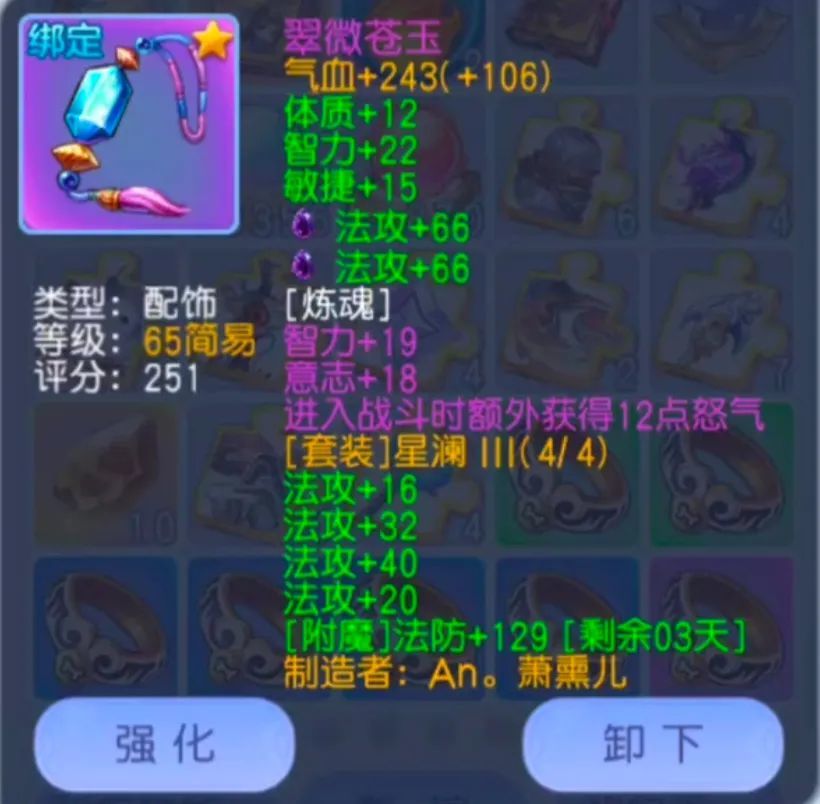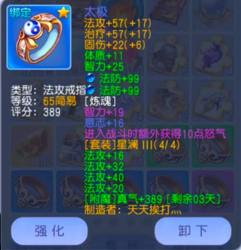 基础属性:戒指建议要尽可能的选择紫色简易!毕竟戒指的基础属性能够带来不俗的伤害加成!这个蓝色的戒指法攻加57在蓝色品质中已经算得上是挺高的一个数据了!