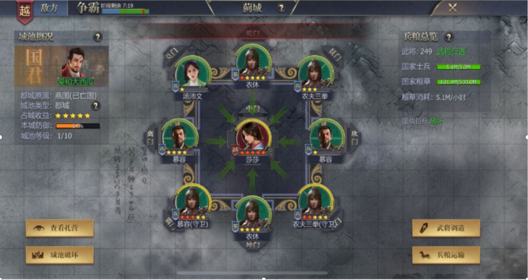 周六,秦燕继续进攻越国,不拿下越国誓不罢休。燕国将领天下为公,朱重八,席去疾继续参战,目标进攻辽东,破坏蓟城。蓟城战斗仍在继续。莎莎大佬又要面临新一轮的攻击啦~与此同时,越国的众将领们,分工有序,少主,南宫小强,红叶,懂王,大器全力运兵运粮,加建城池。激战一触即发。燕越边境战火重燃,辽东,琅琊,孤竹,督亢,战火纷飞连城一片。令人意外的是西线秦越边境,秦国杀出一名猛将 财神,在秦越边境不断进攻巴郡、汉中,函谷关成了激战争夺的核心。