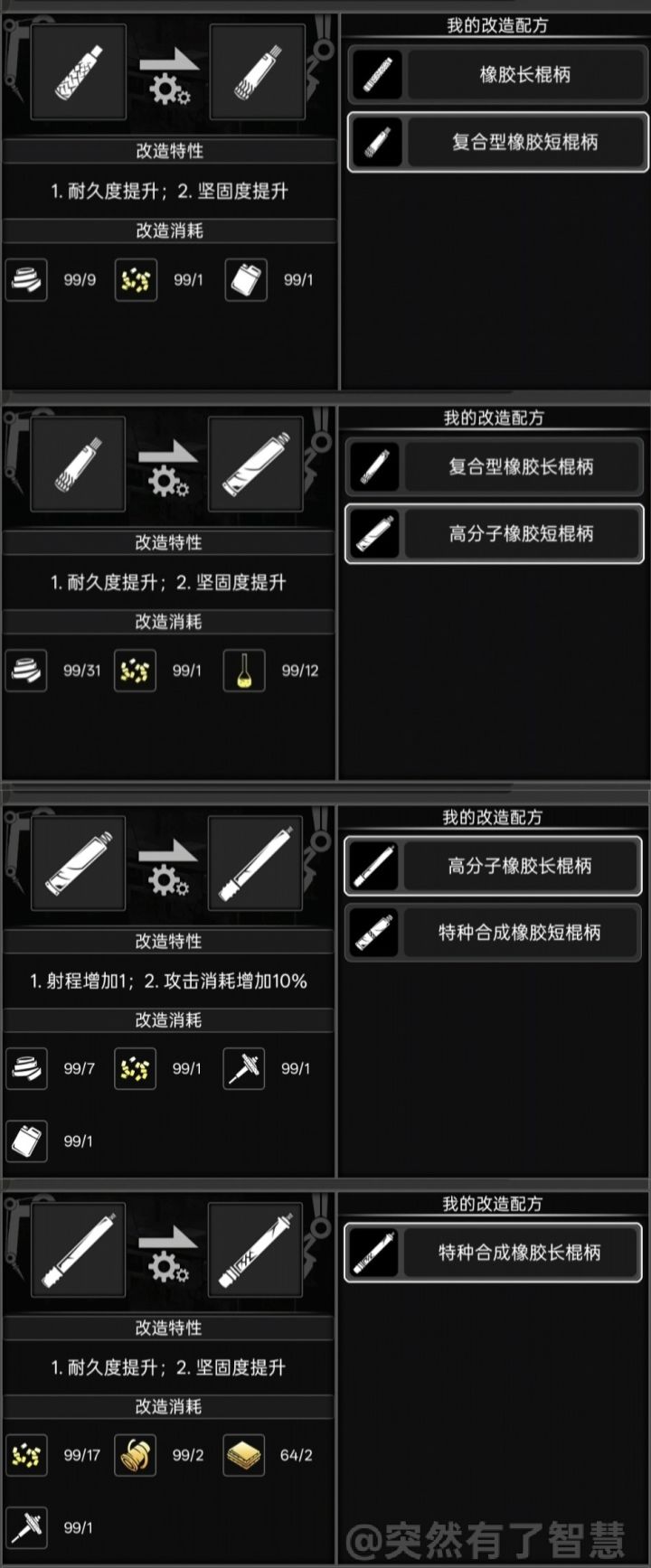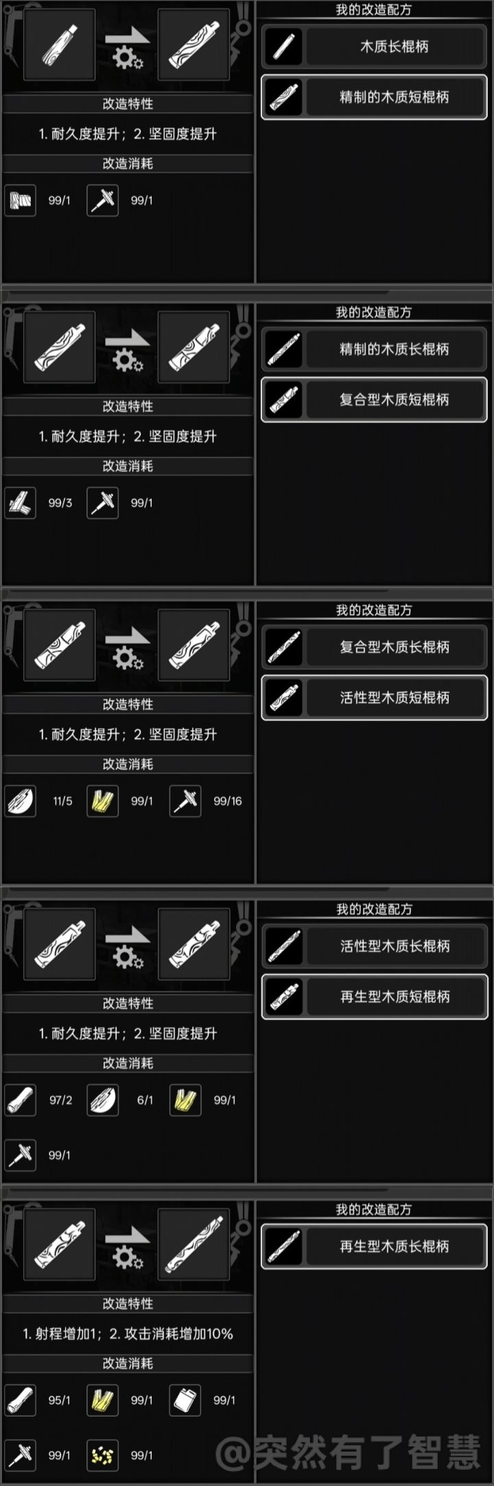 再生木特点坚固度高,可以为武器提供20%左右的耐用。