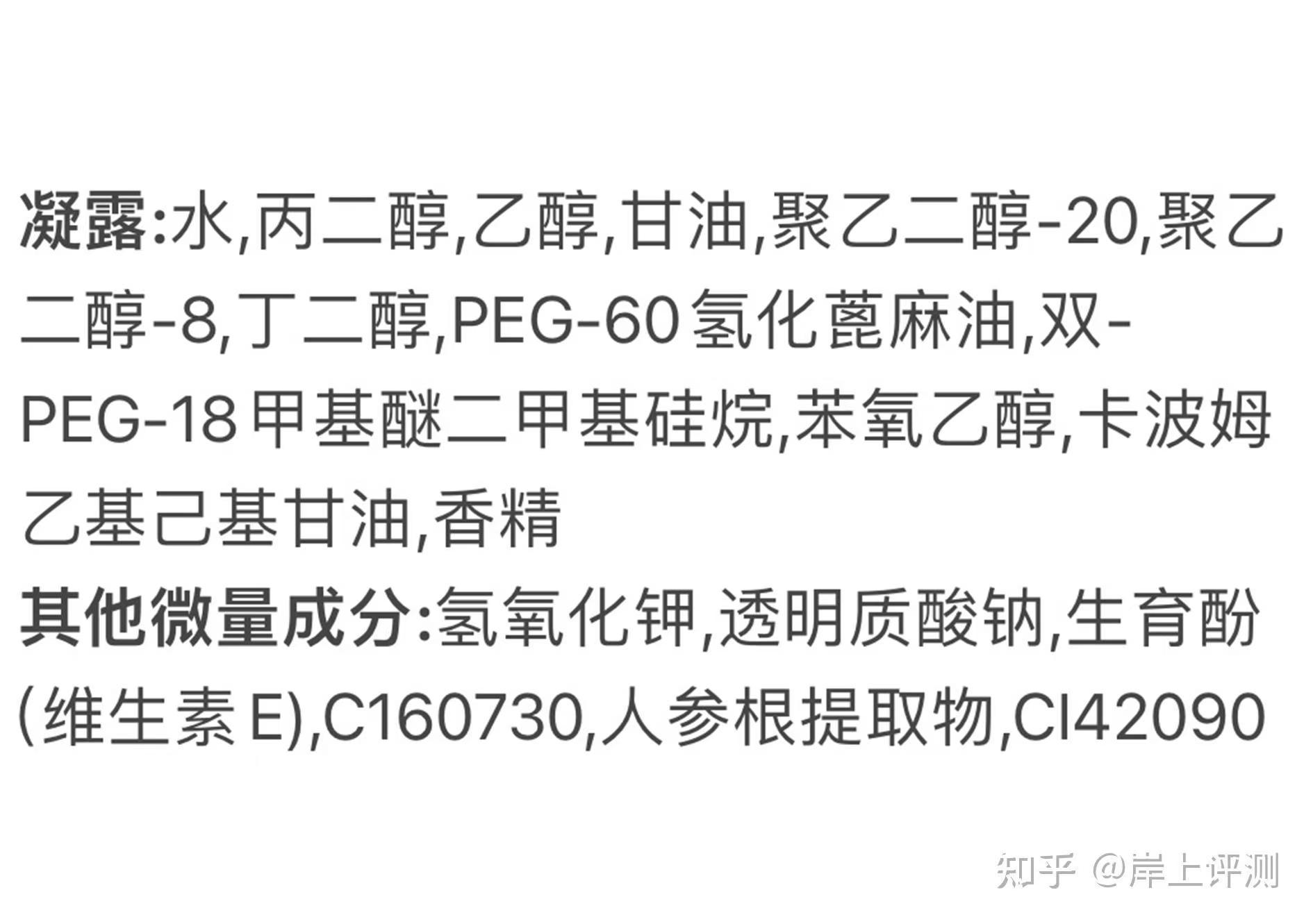 再看看成分,水凝露,以水为主要溶剂,丙二醇,甘油,聚乙二醇-20,聚乙二醇-8,丁二醇,以及微量成分透明质酸钠,构成保湿体系,同时添加了润肤剂,双PEG-18甲基醚二甲基硅烷,所以保湿效果会比一般的水要好一些。酒精排在成分表第三位,添加量不低,可以让肤感轻薄一些,但角质层薄,偏敏感的皮肤需要谨慎。有香精色素的添加,苯氧乙醇搭配乙基己基甘油,构成防腐体系。