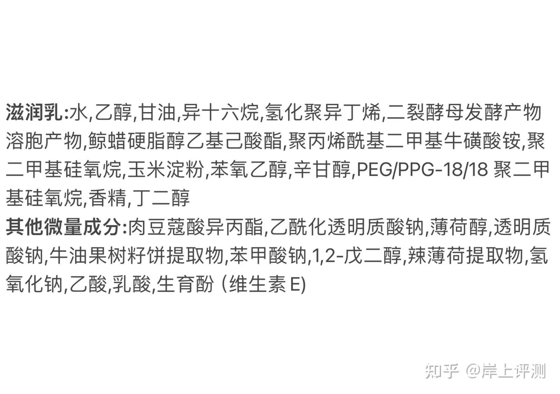 再看滋润乳,以水为主要溶剂,酒精添加量更高,排在成分表第二位,但可能因为有多种润肤剂的添加,肤感还是比较粘。甘油,辛甘醇,丁二醇,乙酰化透明质酸钠,构成保湿体系,二裂酵母发酵产物溶胞产物,带有一点微剥脱效果,加强角质层代谢。润肤剂,异十六烷,氢化聚异丁烯,鲸蜡硬脂醇乙基己酸脂,以及聚二甲基硅氧烷,强化保湿效果。苯氧乙醇构成防腐体系,有薄荷醇和辣薄荷的添加,欧莱雅男士系列的标配,使用起来肤感清凉,但对敏感的皮肤并不友好。需要注意的是,乳化剂,肉豆蔻酸异丙酯有一定的致痘风险,对于痘肌需要谨慎。