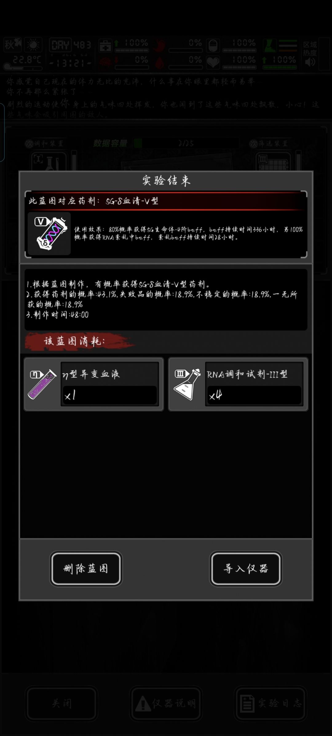 在300天的时候会出现异族入侵任务,完成便可制作心心念念的sg药剂,前面讲过在新城低阶任务就有四阶的sg装置再加上诡首给的八血就可以制作满级的sg药剂,根本没有网上说的那么麻烦,怀斯的唯一作用就是卖rna,好感度也不用刻意刷一口满级sg下肚就差不多满了