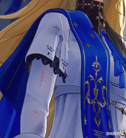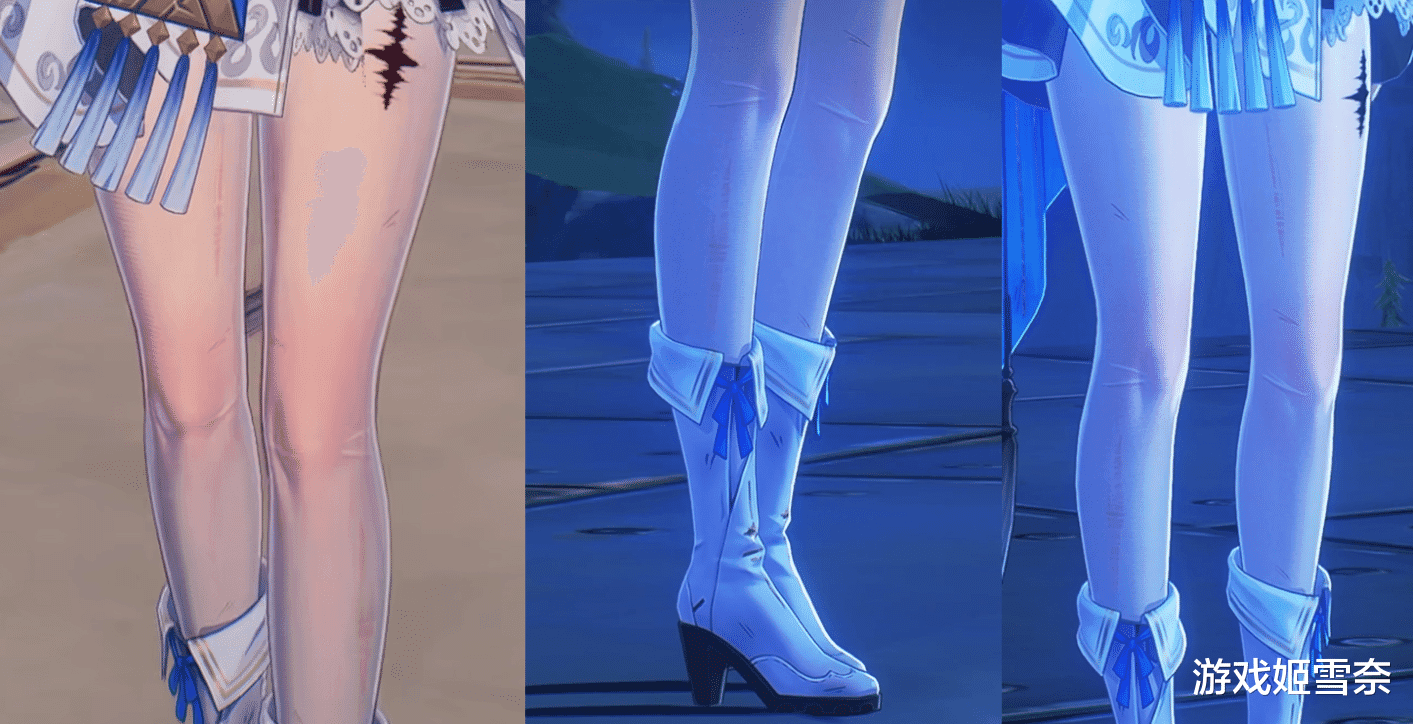 而大家最关心的白丝部分做的也是最精细的,两大腿侧面有很明显的丝线崩裂效果,往下一点,除了库洛引以为傲的膝盖处白丝透肉效果,还有在小腿上更宽的划痕,你说敌人真坏吧,把教士服划破了却划不破这条白丝(滑稽),不过这种藕断丝连的感觉更人人欲罢不能呢!另外其实这里库洛偷懒了,两腿上的战损痕迹是中心对称的,两边的战损位置和大小都是相同的,看起来稍微有些出戏。