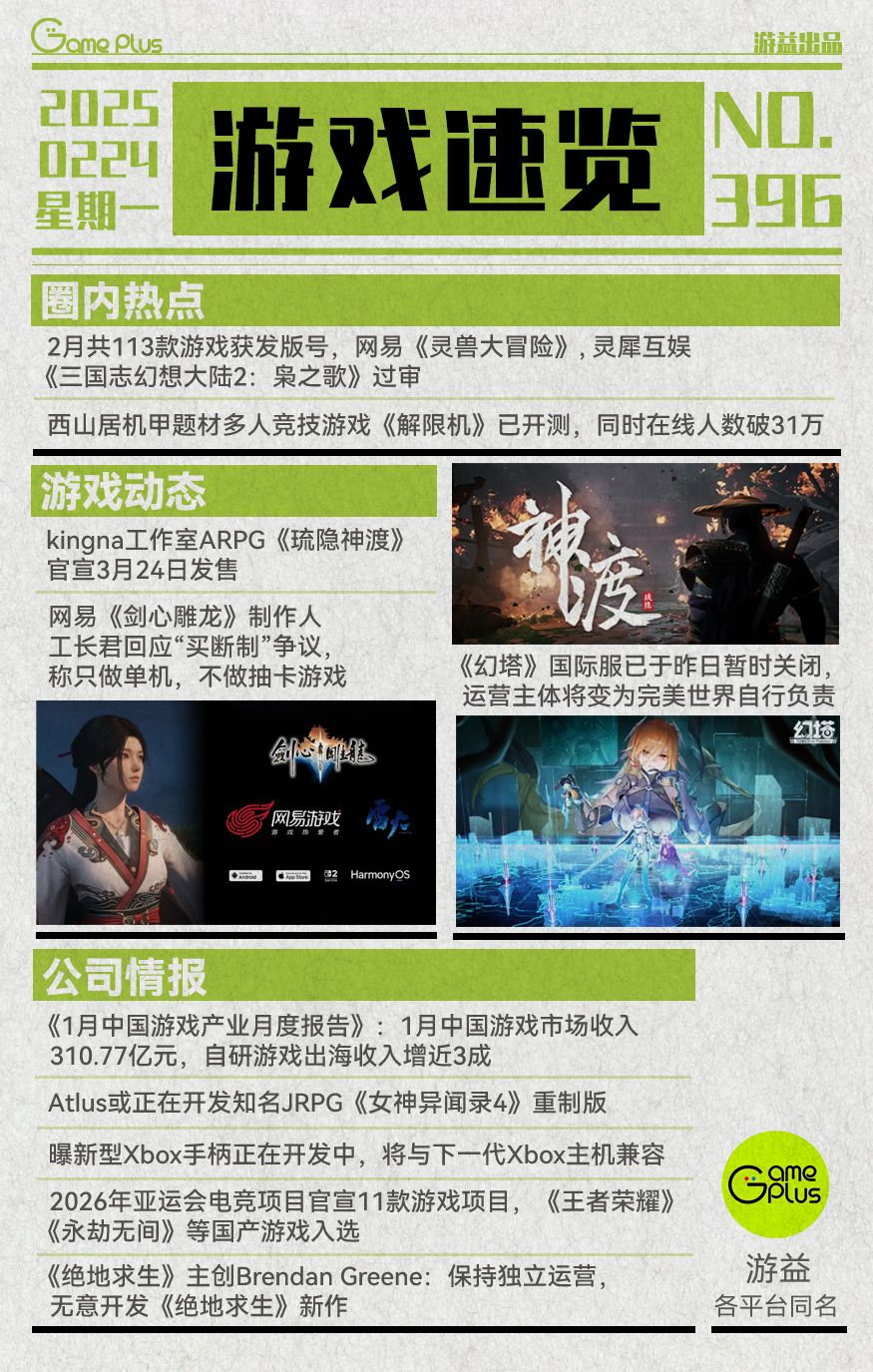1.《1月中国游戏产业月度报告》:1月中国游戏市场收入310.77亿元,自研游戏出海收入增近3成