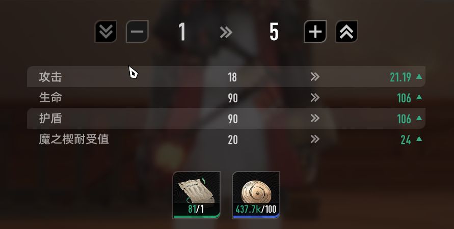 初始耐受值为20,每级增加一点耐受值(最多100点,最高100级),并随等级的提高相同增加定量的攻击、血量、护盾值