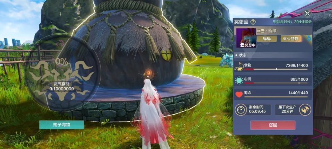 Tips:冥想舍每周使用时长上限为20小时,时长消耗完后不可继续生产;冥想舍最多可储存1000万灵气,达到上限后停止生产,注意及时使用哦~