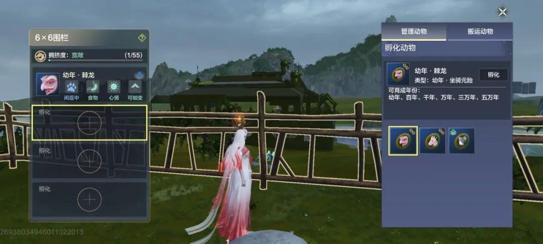 点击围栏界面左侧的空位,选择要孵化的幼年元胎,即可孵化动物开启养殖。