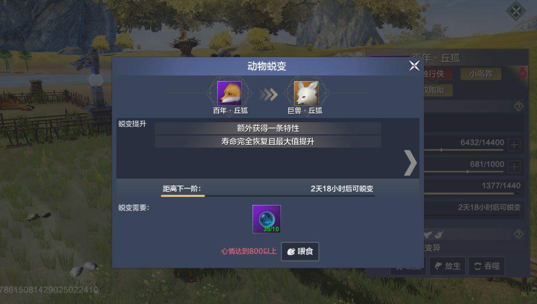 通过围栏界面,旅者可看到动物的性格特点、性别以及状态,还可以对动物进行【喂食】、【蜕变】、【放生】、【吞噬】操作。