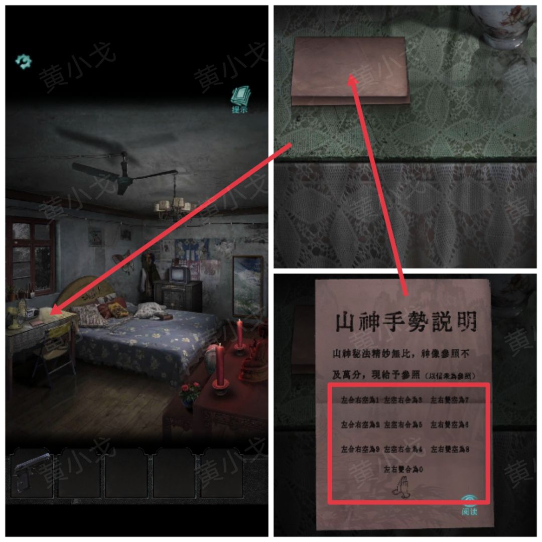 7.点击柜子上的密码锁,根据山神手势说明和山神像手势变化,输入密码:31742