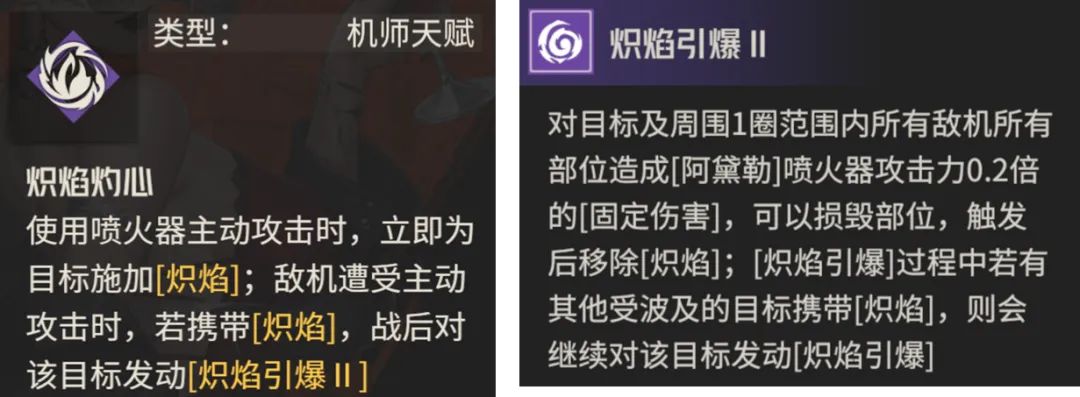 首先阿黛勒的天赋读起来可能有点不好理解,但简单说其就是在阿黛勒攻击敌方时,敌方会立刻被施加一个“炽焰”的状态,而在任意己方攻击带有“炽焰”状态的敌方后,敌方都会立刻触发1次群体范围内的固伤(基础状态下为目标周围1格,解锁γ2区16算力后就是目标周围1圈),这就是“炽焰引爆”的效果,且基础引爆的伤害是每个部位0.2倍伤害,相当于对方如果部位都健在的话,加起来总和应该有0.8倍的固伤(而潜能3后这个固伤可以提升为每个部位0.3倍伤害,但前提是对方必须在燃烧地形上才能触发次效果)。