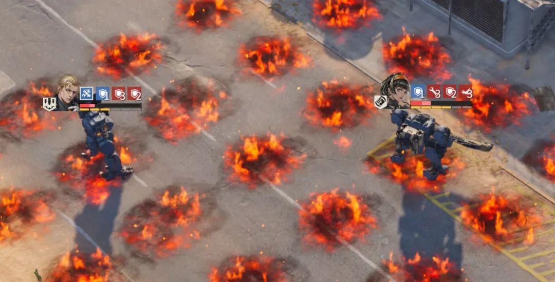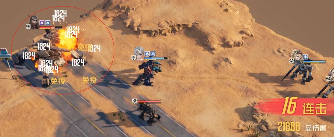 当然这里需要特别提一句的就是,阿黛勒在自身攻击敌人后,敌人也可以立刻触发“炽焰引爆”的效果,且由于喷火器武器自身较为特殊的攻击路径机制,例如上图中维一是想要攻击阿玛特的,但由于喷火器的攻击路径便可以自动带到阿玛特前边的这个小飞机,因此小飞机和阿玛特都被施加了“炽焰”状态,且在阿黛勒主动攻击结束后这两个敌人还会各自触发1次范围引爆,相当于这一次攻击的总伤害就等于:阿黛勒的普攻输出(包含阿玛特和小飞机)+阿玛特引发的1次范围爆炸+小飞机引发的1次范围爆炸。所以搞清楚这个逻辑后我们便可以很好的了解到,阿黛勒想要打出成吨的伤害,其必须具备几个前提条件: