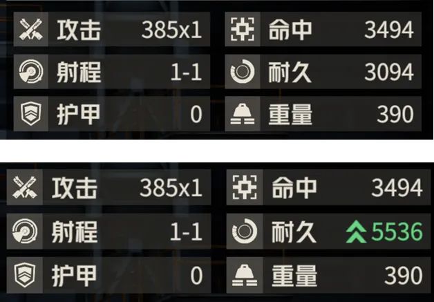 那么此专武的第三个特性为提升盾牌的耐久,但这个提升并非是直接让我们持盾手的耐久范围,因为它只会让盾牌提供的耐久翻倍,就像是下图中所演示的这般,所以下边的第二幅对比图就给大家演示了在不带专武和带了专武后的持盾手血量提升,的确有,但并没有达到很夸张的程度。