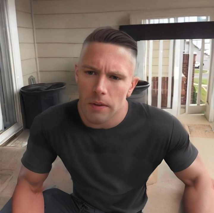 图中是一位男性,从画面来看暂时无法确定他的身份。他穿着黑色短袖T恤,发型是侧分渐变短发,表情严肃,背景是一处房屋的门廊,摆放着垃圾桶。
