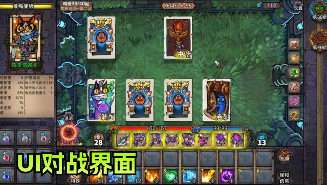 独创 “点杀式卡牌”玩法,单手即可畅快战斗!通过装备、法术、药水、神器的随机组合,搭配 物理/魔法双系克制机制,形成吸血流、暴击流等百变流派。看似轻量化的操作背后,隐藏着烧脑的即时策略博弈——是清空关卡还是保留体力冲刺BOSS?每一次抉择都关乎胜负。