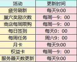 目前各玩法更新时间如下图所示,请玩家们合理安排时间哦!