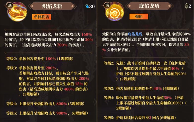 1.专属偃兵拥有高额的护盾转伤机制,搭配烛阴本身本身的高额护盾,能够对敌方单体/全体造成非常高的间接伤害,搭配奇术1提升护盾上限,能够打出更高的间接伤害;主要养成属性为生命加成、攻击加成。