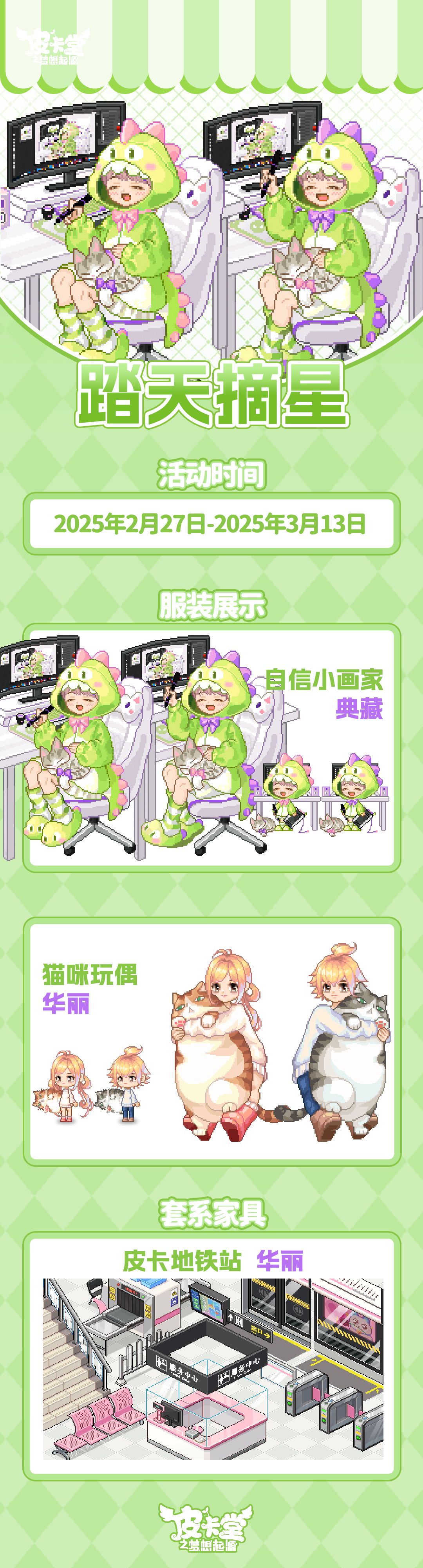 -【踏天摘星】不枉有心者,踏天赴星约,参与活动将有机会获得典藏套装「自信小画家」、华丽套装「猫咪玩偶」以及套系家具「皮卡地铁站」!