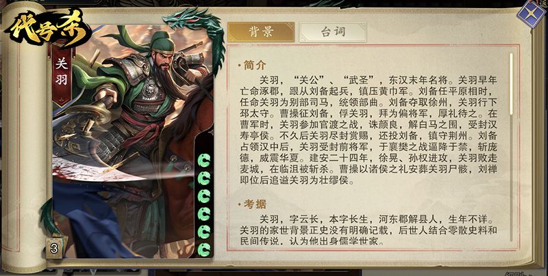 将军们,你们知道吗?我们的游戏是以古代历史为背景,汇聚了全历史武将。从三国到唐宋,从武将到谋士,将军们可以自由收集自己喜欢的角色。此外,游戏内的所有武将的技能设计,均取材于真实的历史典故——关羽的“武圣”可将任意牌化作“杀”,重现其万军之中取上将首级的威猛;赵云的“一身是胆”可以在出“闪”后立即出“杀”,攻守之间游刃有余;诸葛亮的“锦囊妙计”可随机增添一张专属战法牌,再现其运筹帷幄的智者风范;