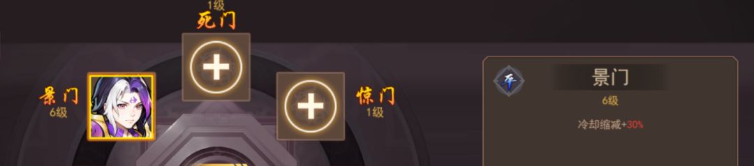 (1)景门——冷却缩减:从初始1级5%到6级30%,适用二技能强力武将,如司马懿、华佗等。理论上神兵冷却缩减最高44.1%+6级30%冷却缩减=74.1%,12秒缩短到3.11秒。单论司马懿来说,6级二技能3.2秒控制,能做到无线控制(不考虑霸体、三韧等情况下)。
