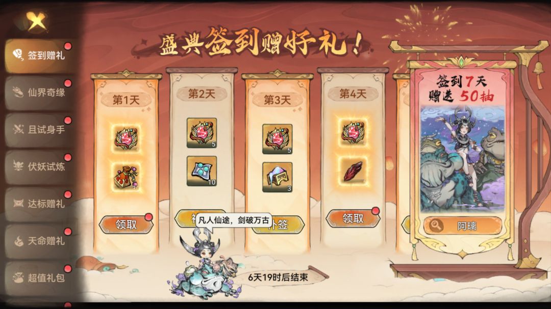 活动期间,祖师完成7日签到即可获得寻仙令*50等签到奖励。
