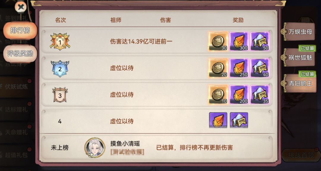 活动结束后,依据祖师对不同首领单次挑战造成的最高伤害分别进行跨服排名,上榜即有机会获得许愿币、古宝升星石等奖励。