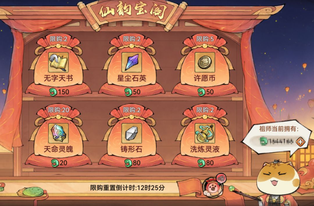 宝阁每天都会上架星尘石英、无字天书等奇珍物品,祖师可消耗灵玉限量购买宝阁内的道具。