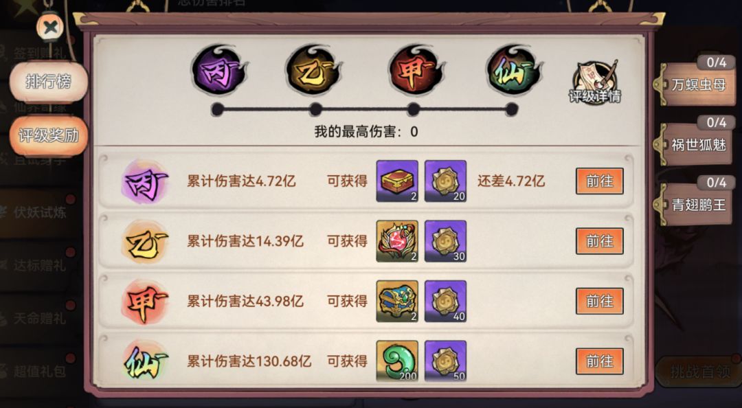 完成不同怪物的挑战可获得寻仙令、许愿币等通关奖励或伤害评级达标奖励。