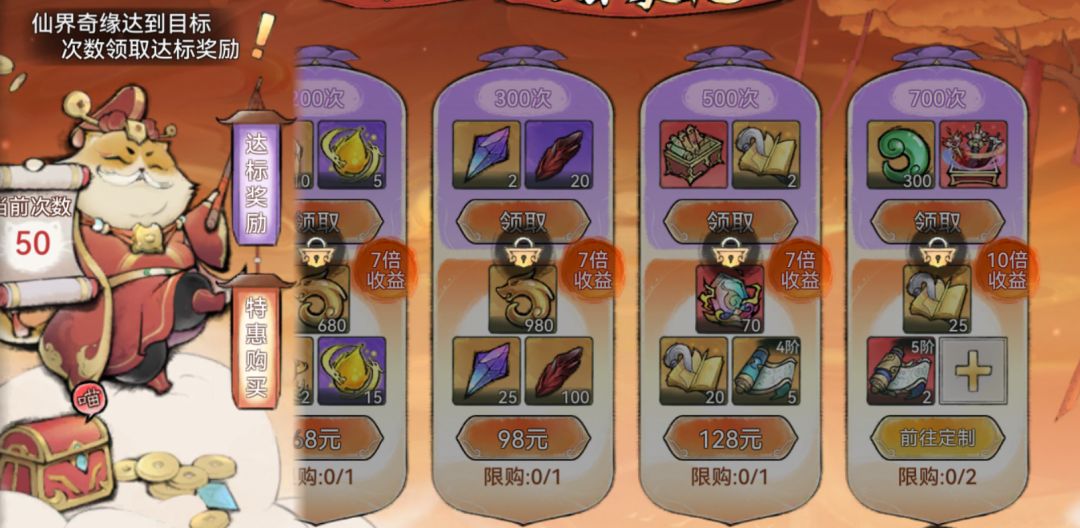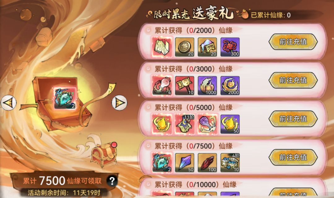 活动期间,祖师在【仙界奇缘】活动中抽取次数达到目标要求,即可免费领取传世功法箱、传世道兵箱等达标奖励,同时还会解锁不同档位特惠礼包的购买权限。