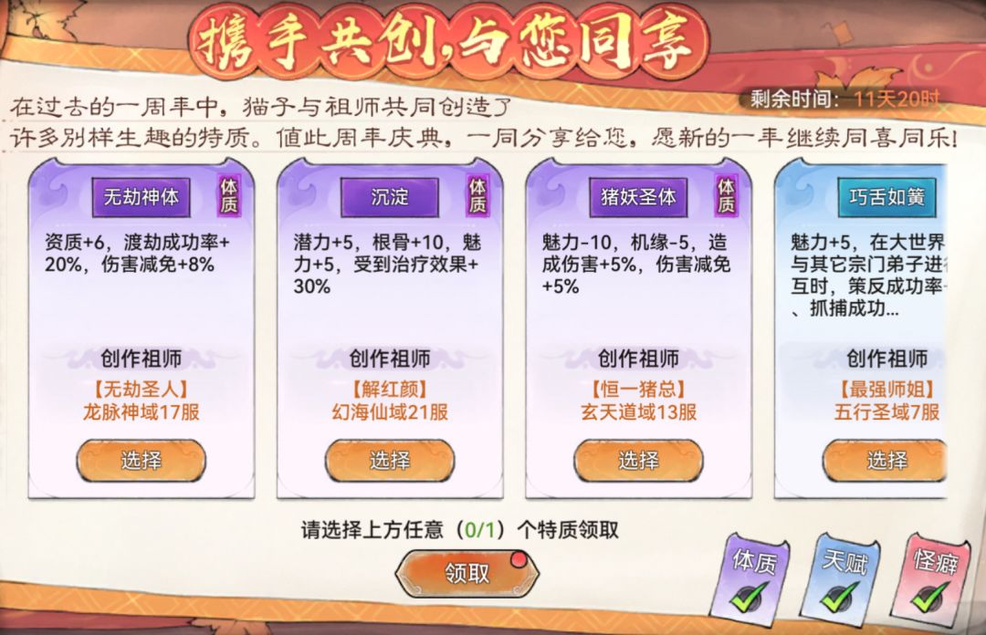 活动期间,祖师可以从29种祖师共创特质中选择1种免费领取。