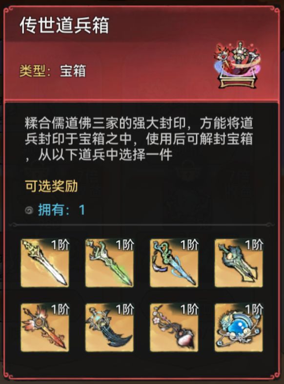 仙缘寻访次数达到700次可领取【传世道兵箱】,可从焰羽、巨灵等道兵中自选一件。